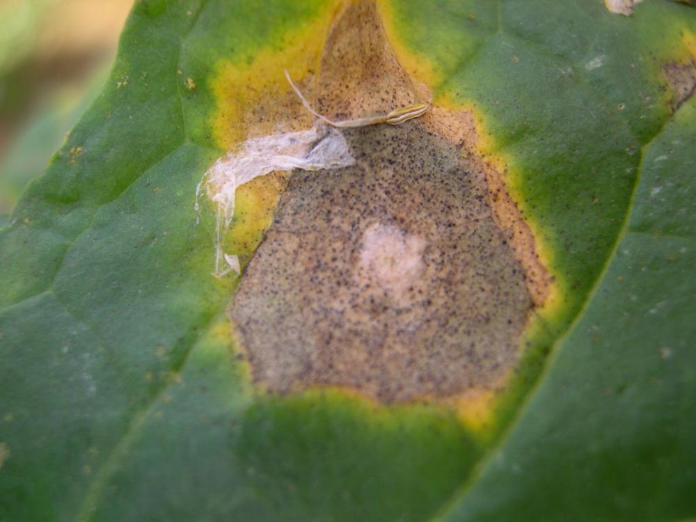 Les premiers symptômes seront observés sur les feuilles situées en parties basses du colza. Cette maladie se manifeste sous la forme de taches brunes, portant de très nombreuses petites fructifications noires (pycnide et périthèces), entourées d’un halo jaune assez marqué. Ces fructifications ne sont pas réparties de manière homogène dans les taches, en effet, celles-ci forment une alternance de zone avec une présence dense (anneau foncé) et peu abondante (anneau clair) de pycnides et périthèces.