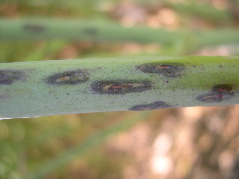 Sur la tige, Mycosphaerella entraine la formation de taches ovales gris foncé, possédant un centre plus clair. Enfin sur siliques, les symptômes se manifestent sous la forme de taches brunes/grises, arrondies, pouvant devenir coalescente en cas de forte attaque, couvertes de fructifications denses plus ou moins arrangées en cernes concentriques.