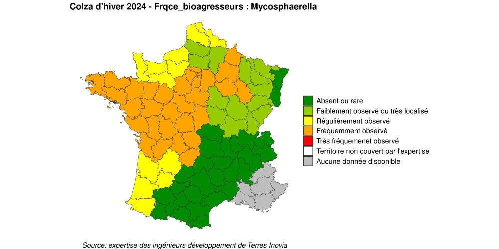 L’année 2024 a connu une explosion de la maladie sur le territoire, des régions jusqu’alors épargnée se sont vues fortement attaquée par Mycosphaerella. Dans de nombreux cas, la maladie s’est développée sur les siliques, ce qui n’avait jamais été vu dans certaines régions. Les conditions météorologiques très pluvieuses et douces du printemps 2024 ont été idéales pour le développement de la maladie ce qui peut expliquer la fréquence du Mycosphaerella cette année-là.