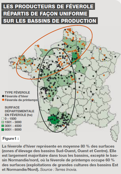 Le type de féverole conditionne l’itinéraire technique pratiqué dans les différents bassins, en particulier pour le nombre de traitements fongicides, plus élevé en féverole d’hiver (trois passages) qu’en féverole de printemps (deux passages).
