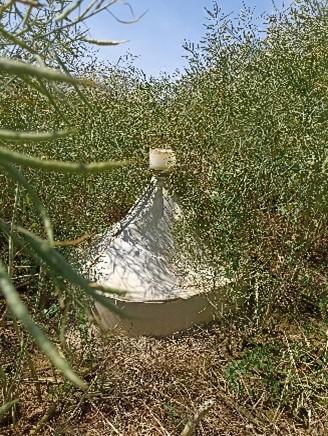 Photographie d'une tente à émergences pour suivre la population d'altises dans un essai sur le site de Bretenière (Terres Inovia) en juin 2024.