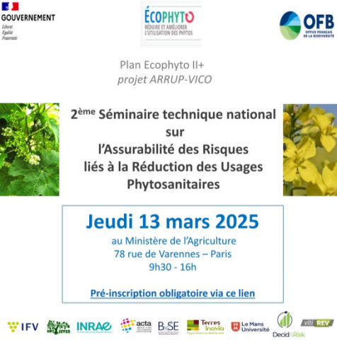 « Assurabilité des Risques liés à la Réduction des Usages Phytosanitaires sur Vigne et Colza » - le projet ARRUP-VICO étudie comment pourraient être couverts les risques découlant d’une réduction des usages phytosanitaires. Il vise à examiner les modalités d’assurance envisageables et leur compatibilité avec le cadre réglementaire actuel. La déclinaison sur la vigne et le colza permettront de modaliser les équilibres risques-prévention-indemnisation ainsi que de préciser l’acceptabilité par les acteurs et les questions restant à éclairer.