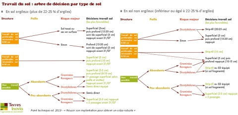 Le résultat du diagnostic du sol, ainsi que d'autres critères tels que la restitution des pailles de céréales ou certaines risques liée à la parcelle, comme la présence de graminées offre plusieurs possibilités de gestion de l’interculture décrites dans les arbres de décisions ci-dessous (cas des sols à comportement argileux).