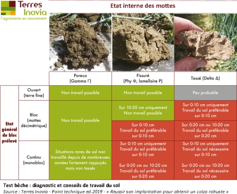 Le croisement de ces 2 informations, état du bloc et état interne des mottes, permet de déterminer une profondeur de travail du sol à mettre en œuvre pour préparer le colza. Le tableau de détermination ci-dessous, permet d’établir un premier diagnostic en fonction des observations.