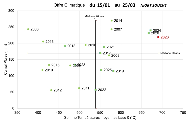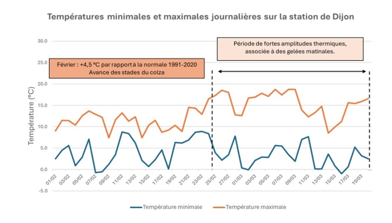 Des cumuls de températures excessifs, des journées anormalement chaudes et ensoleillés fin février, bien supérieures aux normales de saison (par exemple +4.5°C à Dijon par rapport à la période 1991-2020) ont accéléré l’évolution des stades. Depuis la reprise de végétation en janvier / février jusqu’aux stades E-F1, au moins 15 jours d’avance de stades par rapport à l’habitude étaient constatés. Par la suite, cette évolution s’est vue ralentie par l’arrivée d’une période plus froide qui n’a pas permis de poursuivre sur un tel rythme.