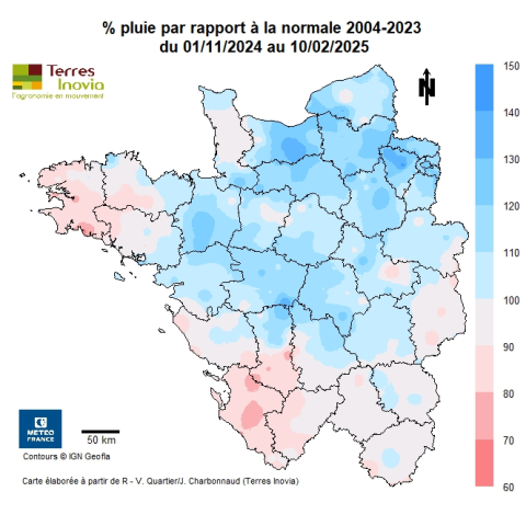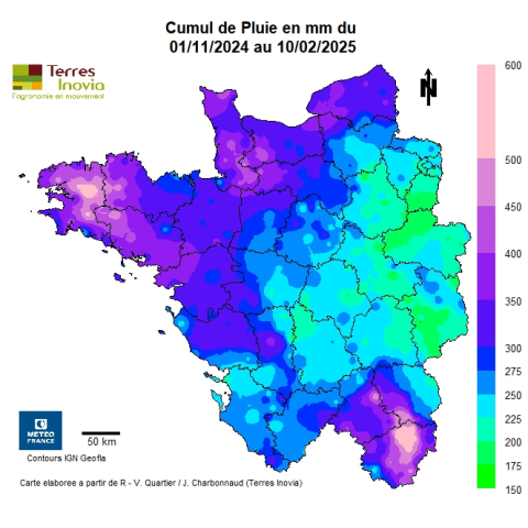 Au-delà de 350 mm cumulés de novembre à février, on considère que le risque de lessivage du soufre est élevé. Cette année, le mois de janvier a été particulièrement arrosé. Les régions de Normandie, Pays-de-la-Loire, Bretagne et Poitou-Charentes ont toutes enregistré des valeurs de 150 mm, allant jusqu’à 300 mm de pluie en Bretagne.