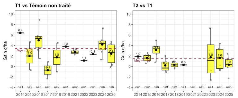 Le potentiel de rendement est un facteur clé : à climat équivalent, les parcelles à fort potentiel (>40 q/ha) valorisent bien mieux la protection (souvent 3–5 q/ha au G1), en comparaison aux cas de potentiel limité (<30 q/ha) qui montrent des gains <2 q/ha au G1 et <1 q/ha pour le deuxième fongicide.