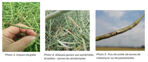 - Après des ouvertures +/- partielles des siliques suite à des contraintes particulières. Ex : coups de vent, orage, grêle (photo 3), coups de bec, larves de cécidomyies (photo 4), etc.