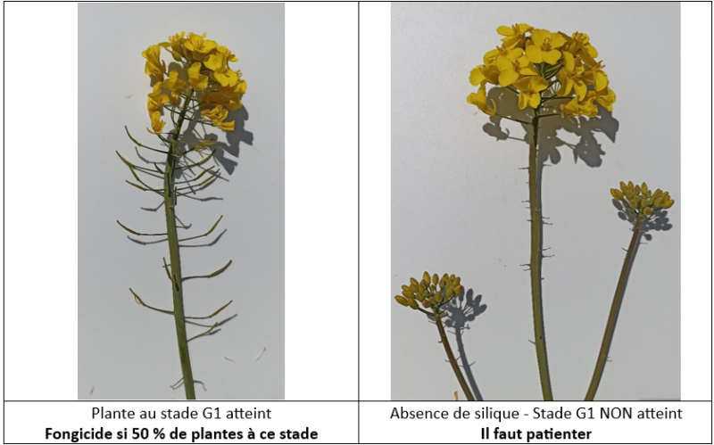 - 1er traitement T1 au plus proche du stade G1 (30 à 50 % des plantes à G1) pour protéger les plantes les plus en avance : PROPULSE 0,5 à 0,7 l/ha OU EFILOR 0.5 l/ha