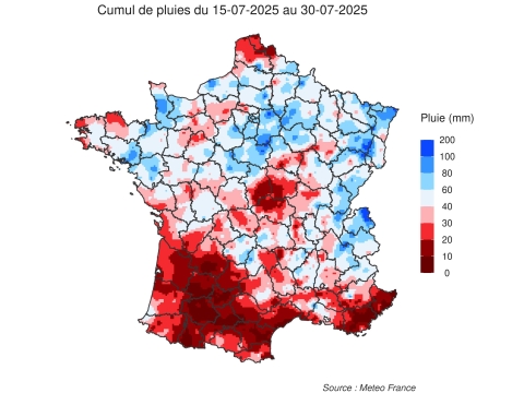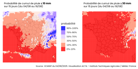 Parallèlement, les cumuls de pluie prévus dans les 15 jours à venir sont globalement très faibles : aucun secteur n’excède 50% de probabilité de cumuler plus de 10mm de pluie d’ici au 18 août.
