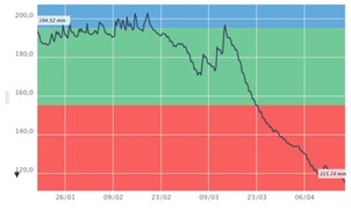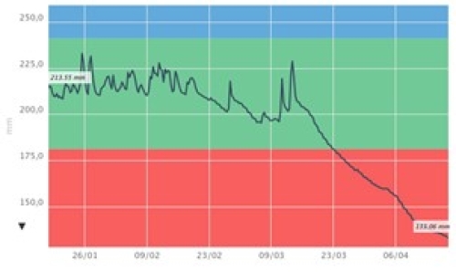 Des sondes capacitives SENTEK sont installées dans plusieurs parcelles (85, 79 et 17) dans le cadre du projet OROFIT (financements ANR PRC OroFit). Leurs relevés montrent l’utilisation complète de la Réserve Facilement Utilisable autour du 20 - 25 mars pour l’ensemble des types de sol (groies superficielles, moyennes et profondes, limon et terres rouges). Ces mesures de l’état hydrique du sol illustrent le déficit hydrique subi par le colza.