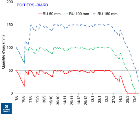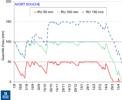L’absence de précipitations depuis la mi-mars a fait chuter l’eau disponible de la réserve utile. Les colzas en sols superficiels sont en stress hydrique depuis début avril, déficit décalé à la mi-avril pour les sols intermédiaires :