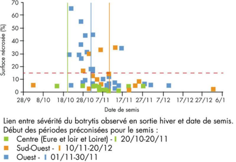 Le botrytis est très présent dans le sud-ouest. Il se développe en particulier dans les situations de semis précoce. Cette relation entre la surface nécrosée par le botrytis en fonction de la date de semis, est illustré par le graphique ci-contre.