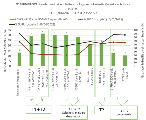 traduit les résultats obtenus en 2023. On y observe que la surface foliaire touchée par le botrytis sur le témoin est de 65% au 15/05 et de 92% au 06/06.
