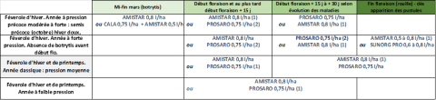 Les attaques de botrytis sont d’autant plus difficiles à gérer, qu’elles ne sont pas prises aussitôt l’apparition des symptômes. Dès la mi-mars, et même courant février cette année, si les symptômes apparaissent, une première intervention à base de SCALA 0.75 l/ha + AMISTAR 0.5 l/ha est à réaliser. Il s’agit de situations à forte pression. Une seconde intervention d’AMISTAR peut-être réalisée à partir du début floraison. Une troisième application pourra être réalisée entre floraison + 15 j et la fin floraison pour gérer les premières attaques de rouille et compléter le programme sur Botrytis.