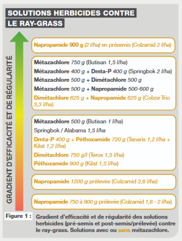 Une autre méthode de contrôle des graminées adventices consiste en un traitement incorporé en présemis avec du napropamide, type Colzamid 2 l/ha (figure 1). Cette pratique offre une meilleure régularité de l’efficacité, tant sur ray-grass que sur vulpin, en particulier dans les situations sèches.
