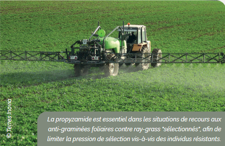 En situation de forte infestation, en complément des interventions de prélevée ou de post-semis/prélevée, une application de propyzamide est nécessaire à partir de novembre, en conditions de sol froid (inférieur à 10°C) et d’humidité, afin d’assurer la pleine efficacité de cette molécule à action racinaire. « L’utilisation des anti-graminées foliaires créent une pression de sélection de résistance des ray-grass à ces solutions. Par conséquent, Terres Inovia recommande l’utilisation de la propyzamide dans ces situations pour éliminer les ray-grass ‘selectionnés’ par l’anti-graminées foliaire, et ainsi réduire la pression de sélection », Arnaud Micheneau, responsable herbicides chez Terres Inovia.