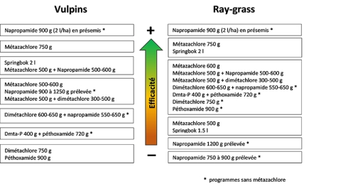 Il faut rappeler que la napropamide, en pré semis incorporé est certes contraignante mais reste de loin la solution la plus efficace contre le vulpin et le ray-grass. Dans la gamme des herbicides de prélevée, seuls les produits à base de métazachlore, de dimétachlore, de dmta-P et de péthoxamide sont efficaces sur ray-grass. Mais attention, sur vulpin, ce sont les herbicides à base de métazachlore qui sont préférentiellement conseillés (NOVALL, ALABAMA, RAPSAN TDI, SULTAN, BANDONEON, etc.).