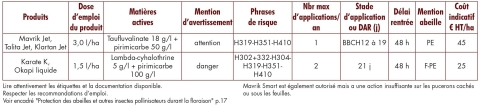 Protection des abeilles et autres pollinisateurs durant la floraisonLa phrase SPe8 définit les conditions suivantes : Dangereux pour les abeilles. Pour protéger les abeilles et autres insectes pollinisateurs, ne pas appliquer durant la floraison ou selon les Autorisations de Mise en Marché (AMM) plus anciennes, ne pas appliquer durant la floraison ou en période de production d’exsudats. L’application est possible pour les usages bénéficiant des mentions « emploi possible », emploi autorisé durant la floraison en dehors de la présence d’abeilles » ou pour les anciennes AMM, les mentions F, PE et FPE. L’arrêté du 20 novembre 2021 encadre les horaires d’application durant la floraison : dans les 2 heures qui précèdent le coucher du soleil et dans les 3 heures qui suivent le coucher du soleil. Cette obligation est étendue aux fongicides et aux herbicides. A terme (renouvellement des AMM), l’autorisation d’application en floraison sera conditionnée par l’AMM, toujours dans le respect des horaires. Lorsque des interdictions supplémentaires sont mentionnées sur l’étiquette des produits, elles doivent s’appliquer. |