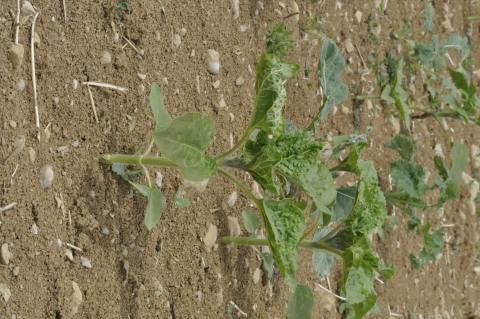 Symptômes de crispations sur feuilles - Crédit photo : L. Jung
