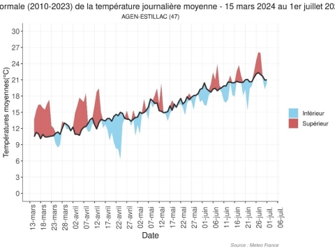 En résumé, des conditions météo délicates voire très difficiles pour préparer et semer les parcelles de tournesol. De nombreux semis ont par conséquent été retardés, nombreux également ont été réalisés dans des conditions de sol humide ce qui, combiné à des températures plus fraiches que les normales en avril et mai (figure 2), a ralenti la levée et le démarrage de la culture, la rendant vulnérable aux attaques de ravageurs de début de cycle.