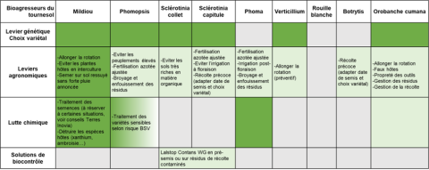 Une 2ème visite peut être programmée quand le tournesol démarre sa phase de maturation (les fleurs ligulées sont tombées, le dos du capitule est jaune citron). Cette visite permet de procéder à un bilan sanitaire complet, qui permettra de capitaliser les informations cruciales sur les maladies et adventices s’étant exprimées sur la parcelle. Ces informations seront remobilisées pour décider des leviers de lutte agronomique appropriés (figure 6), et pour préparer au mieux les prochaines implantations de tournesol sur la parcelle : mise en œuvre de stratégies de lutte mécanique lors des intercultures pour agir sur les adventices problématiques et les vivaces (interventions répétées au cours de l’été, faux-semis), adaptation de la stratégie de désherbage du tournesol à la flore présente, et bien évidemment choix variétal cohérent avec les pathogènes présents sur la parcelle.