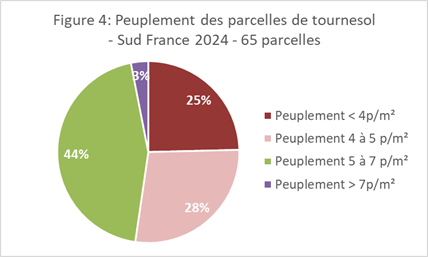 Les équipes de Terres Inovia ont visité de façon aléatoire 159 parcelles localisées dans le Sud de la France, au cours de la 2ème quinzaine du mois de juin. Les observations réalisées montrent qu’une majorité de parcelles (figure 3) présentent un peuplement homogène. Cependant, pour 40% d’entre elles, le peuplement est hétérogène, voire très hétérogène, un niveau plus élevé que les 3 campagnes précédentes. Quant au peuplement en lui-même (figure 4), mesuré sur un échantillon plus réduit (65 parcelles), il est inférieur à l’objectif des 5 pieds par m² dans 53% des parcelles, et bascule dans 25% des cas sous le niveau critique de 4 pieds par m². Ces chiffres illustrent bien les difficultés rencontrées au démarrage, en particulier la préemption par les limaces, très actives cette année, et il faudra faire en 2024 avec des peuplements dégradés (moyenne sur l’échantillon : 48000 pieds/ha).