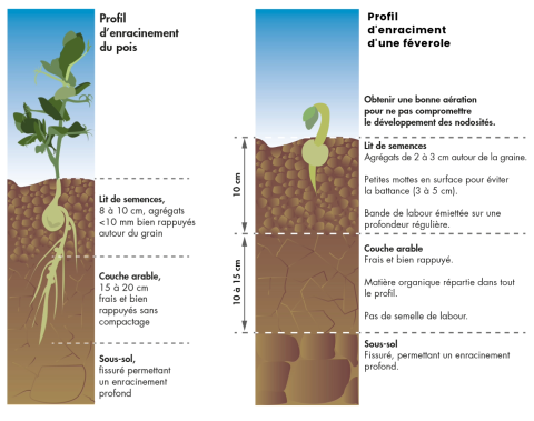 Attention à vérifier et corriger la structure du sol par un travail adapté. Le pois et la féverole, comme toutes les légumineuses, sont sensibles aux compactions, limitant leur enracinement et la mise en place des nodosités. Il est recommandé d’assurer une bonne structure sur minimum 15-20 cm, zone où s’opère l’essentiel de l’exploration des radicelles et de la mise en place des nodosités. Pour assurer l’autonomie azotée de la légumineuse, la symbiose nécessite un sol aéré pour capter l’azote de l’air présent dans ce 1er horizon du sol. En conséquence, vigilance pour les sols à risque de compaction et/ou d’anoxie tels que les sols séchants, les argiles lourdes et les limons battants et hydromorphes pouvant entraver l’alimentation des pois et féveroles.