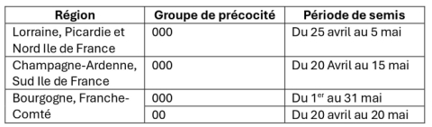 Dans les régions du Nord-Est, les variétés des groupes 00 et 000 sont les plus adaptées, avec une période optimale de semis se situant entre le 20 avril et le 31 mai (détails dans le tableau ci-contre).