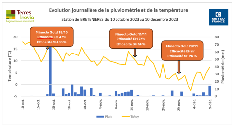 • L’application du 29 novembre est à contrario la moins performante avec seulement 26 % d’efficacité en sortie d’hiver (efficacité entrée d’hiver non mesurée au regard du délai après application). Cette 3ème date d’intervention coïncide avec une séquence climatique peu favorable à l’activité des ravageurs (3.5 °C 3 jours avant, 2.2 °C 3 jours après) et donc moins propice à leur contamination par ingestion.​​​​​​​