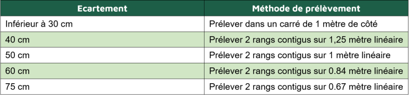 La pesée s’effectue sur 2 à 4 placettes d’1m² en sectionnant les colzas au ras le sol pour une bonne estimation de sa biomasse aérienne. La méthode de prélèvement varie selon l’écartement du colza (voir tableau ci-contre).
