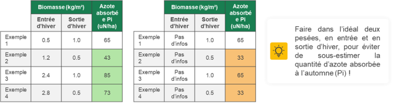 Les colzas du Sud-Ouest ont davantage perdu de biomasse que les campagnes précédentes où, certaines années, ils ne se sont jamais vraiment arrêtés de croître et de se développer. Il convient donc, en plus de bien estimer son objectif de rendement, de prendre en compte l’azote absorbé à l’automne, par une estimation à postériori des biomasses en entrée d’hiver (entre 800g et 1.2 kg/m² en moyenne selon les parcelles) ou par le traitement d’images satellites prises entre la mi-novembre et début-décembre. Le risque de la non-prise en compte de l’azote absorbé à l’automne, lorsque les colzas ont « fondu » au cours de l’hiver, est là-aussi une surestimation des doses à apporter au printemps, en sous-estimant les quantités absorbées précédemment (voir exemples ci-contre).