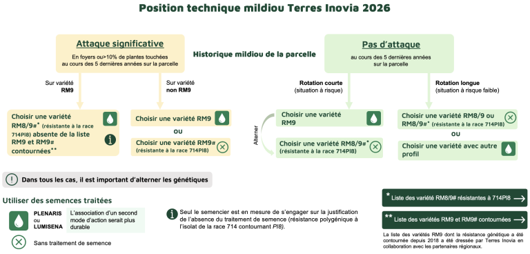 Le schéma ci-dessous explique comment combiner au mieux les moyens de lutte pour bien gérer la situation en fonction de l’historique des parcelles. L’évolution constante des races de mildiou impose une adaptation régulière des stratégies de lutte et des choix variétaux. Les observations réalisées sur le territoire national montrent que, dans la majorité des cas analysés d’attaques de mildiou sur variétés de type RM9, l’isolat en cause correspond à la race 714# (contournant Pl8) C’est pourquoi il est aujourd’hui recommandé de privilégier les variétés dites RM8/9#, résistantes à cet isolat 714Pl8, dans le cas d’attaque précédente sur variété RM9.