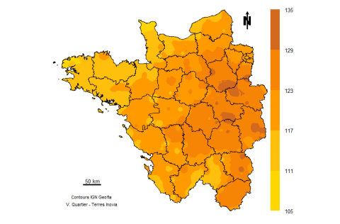 Cartographie 3 : Somme des températures moyennes par rapport aux vingt dernières années en %, entre le 1er novembre et le 1er mars