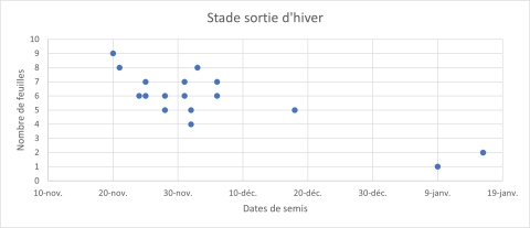 Les observations sur pois d’hiver montrent que les semis effectués en novembre sont entre le stade 5 et 9 feuilles alors que les semis de décembre entre le stade 4 et 8 feuilles.
