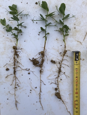 Les observations réalisées montrent que le pivot racinaire se développe bien (à plus de 15cm de profondeur). En revanche, le chevelu racinaire a du mal à se mettre en place, et reste peu développé à ce jour. Les nodosités sont présentes, mais en quantité limitée en raison des excès d’eau qui ont limité leur développement.
