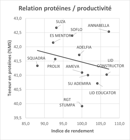 Parmi les variétés proches, RGT SICILIA et RGT STARBELA se démarquent par leur productivité et leur teneur en protéines, qui dépasse 43,5% MS. Elles affichent également une précocité intéressante, proche de la moyenne des essais au 02/10. Elles offrent la meilleure combinaison rendement/protéines/précocité. Ce sont les valeurs sûres de la série.
