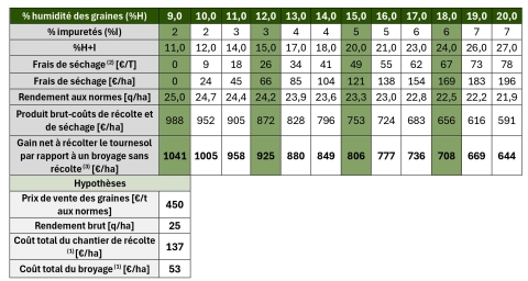 Simulations des résultats économiques liées à la récolte du tournesol selon différents taux d'humidité de graine, dans un contexte de rendement à 25 q/ha et un prix de graine de 450€/t