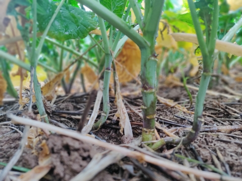 - L'état de croissance au moment de la décision : le risque élevé s'applique aux “gros colzas”, vigoureux et poussants, avec port en rosette, pivot bien développé et feuilles les plus développées très longues (> 20 cm entre la base du pétiole et le bord du limbe).