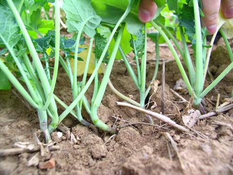 - L'état de croissance au moment de la décision : le risque élevé s'applique aux “gros colzas”, vigoureux et poussants, avec port en rosette, pivot bien développé et feuilles les plus développées très longues (> 20 cm entre la base du pétiole et le bord du limbe).