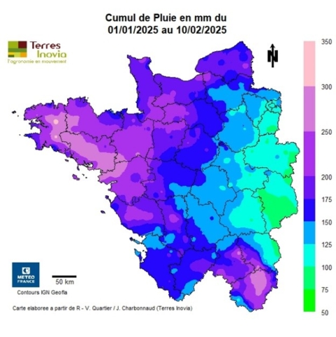 Les précipitations atteignent plus du double des quantités « normales » en janvier dans de nombreuses régions. Ce temps très humide et les températures conformes ou sous les normales de saison depuis début 2025 provoquent forcément un « réveil » assez calme du colza. Les parcelles gorgées d’eau manifestent des rougissements parfois très prononcés (asphyxies racinaires).
