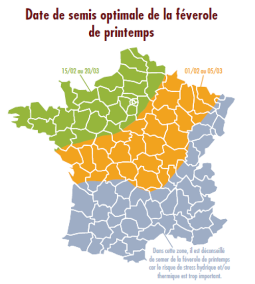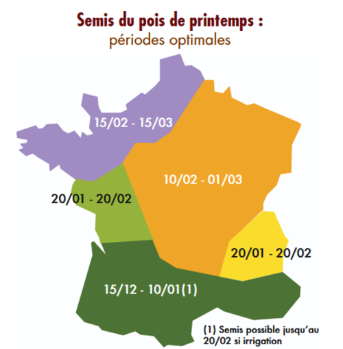 Les dates de semis des protéagineux de printemps sont à adapter à la zone géographique. En Poitou-Charentes et en Vendée, les semis peuvent démarrer dès fin janvier si le sol est bien ressuyé et si des températures gélives fortes ne sont pas attendues dans les 2 à 3 jours qui suivent le semis (gel possible des graines lors de l’imbibition). À noter qu’il est possible de semer sur sol gelé, la graine s’imbibera une fois la phase de gel passée. Si les conditions de portance le permettent, favoriser les semis précoces, qui permettent de diminuer l’exposition de fin de cycle des protéagineux aux stress climatiques (hydrique, thermique).