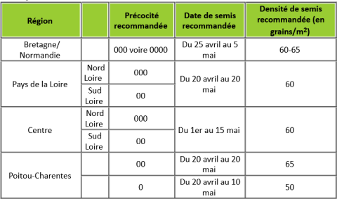 Le raisonnement du choix de la variété et de la date de semis doit prendre en compte la date de récolte. Dans nos régions, on vise une récolte autour du 25 septembre afin de récolter dans de bonnes conditions avant le retour des pluies automnales. Ainsi, les précocités variétales les plus adaptées dans le bassin Centre-Ouest sont les variétés 00 et 000 (voire 0000 pour certains secteurs de Bretagne et Normandie. Pour les secteurs les plus froids de ces régions, il est important de noter que les sommes de températures ne sont pas suffisantes pour garantir des dates de récolte satisfaisantes).