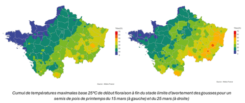 Le stress thermique : le potentiel commence à être affecté dès 20°C cumulés au-delà de 25°C en température maximale journalière durant la phase de floraison et le début remplissage. Les simulations sur le nord de la France montrent que des semis du 15 mars sont encore possibles en limitant le risque dans la plupart des secteurs. Seuls certains secteurs du Centre-Est présentent des risques plus importants de stress thermique. Dans ces secteurs à risque thermique élevé, un semis du 15 mars reste possible en pois sous réserve d’un sol à bonne réserve utile permettant de compenser les pertes d’eau par évapotranspiration.