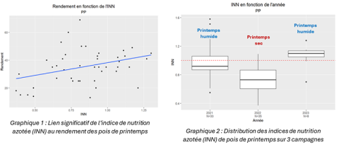 Pour illustrer la qualité de la nodulation et l’intérêt de conditions humides en début de cycle, on peut observer l’indice de nutrition azotée (INN) à début floraison. Cet indicateur traduit une alimentation azotée optimale si la valeur observée est ≥1. En dessous de 0.8, on considère que la plante est en carence azotée. Des mesures d’indice de nutrition azotée (INN) réalisées en 2021, 2023 (années à printemps humides) et 2022 (à printemps sec) montrent des INN plus élevés en faveur des printemps humides (cf. graphique 2).