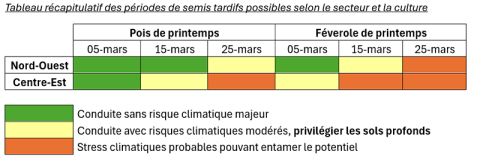 Pour le Poitou-Charentes, les semis de protéagineux de printemps sont déconseillés en mars au regard de nos résultats d’essais dates de semis en pois et du risque de stress thermique et hydrique en périodes sensibles de floraison-remplissage.