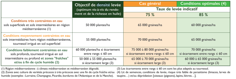 La densité optimale de semis dépend des contraintes hydriques, du type de parcelle, de l’écartement entre rangs et du climat régional, notamment en zone fraîche ou humide en fin de cycle. En moyenne, elle se situe entre 65 et 70 000 graines/ha pour optimiser rendement et teneur en huile. Avec un écartement supérieur à 60 cm, il faut éviter les surdensités sur la ligne pour limiter la concurrence entre pieds. Un écartement de 40 à 60 cm est préférable, permettant un gain de 1 à 4 q/ha par rapport à un semis large type maïs (75-80 cm).