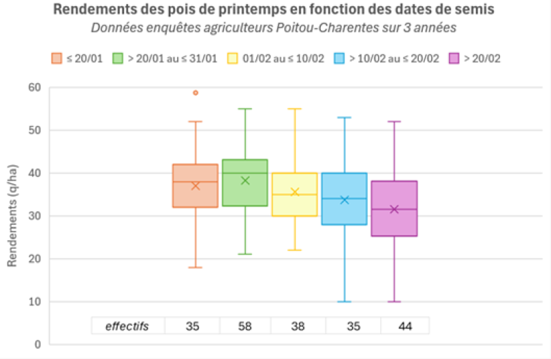 Les enquêtes réalisées par Terres Inovia sur les pratiques des agriculteurs ont permis d’étudier l’impact de la date de semis sur les rendements des pois de printemps. Sur les trois années d’étude (2017, 2020 et 2023), une tendance se dégage : les pois de printemps semés avant la date du 31/01 ont en tendance des rendements plus élevés que ceux semés après la date du 20/02. Les semis tardifs réduisent le rendement médian et augmentent sa variabilité.
