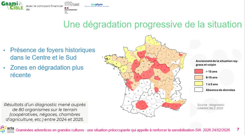 Un diagnostic mené auprès de 80 organismes (coopératives, négoces, Chambres d’agriculture) sur le terrain entre 2024 et 2025 montre une présence de ray-grass et de vulpins sur l’ensemble du territoire. Si les foyers historiques dans le Centre et le Sud se maintiennent, d’autres apparaissent dans le Nord et l’Est.