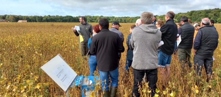 Benjamin Delhaye, ingénieur terres Inovia, a animé les échanges auxquels a participé une vingtaine de personnes. Un des points abordés a été l’itinéraire technique du soja bio en anglant sur les stratégies pour limiter la biomasse des adventices.